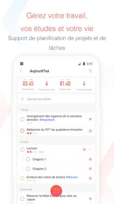 Allez au-delà de la simple exécution avec les fonctionnalités d'analyse détaillées de Focus To-Do. Des rapports visuels vous offrent une vue d'ensemble précieuse sur la répartition de votre temps et vos progrès, vous permettant d'affiner continuellement vos stratégies de productivité. Que vous soyez sur votre téléphone, tablette ou ordinateur, la synchronisation universelle garantit une transition fluide entre tous vos appareils, y compris les montres connectées. Ajoutez à cela des options uniques comme la "liste blanche" d'applications pour bloquer les perturbateurs et la visualisation de votre concentration sous forme d'arbre, et vous obtenez une expérience enrichie, conçue pour vous propulser vers l'excellence sans stress.
