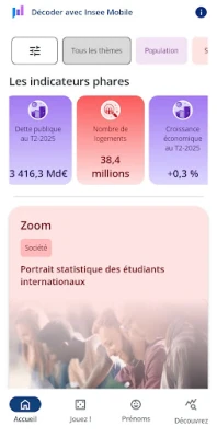 Grâce à une interface intuitive et captivante, l'application Insee vous invite à explorer les indicateurs phares qui façonnent notre société : démographie, emploi, chômage, revenus, et croissance économique. Restez au fait de l'actualité socio-économique grâce à des mises à jour régulières, et aiguisez votre compréhension avec des infographies claires et des définitions précises, conçues pour éclairer chaque concept statistique.