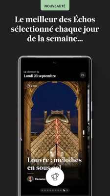 L'expérience de lecture est conçue pour être aussi fluide qu'intuitive, vous permettant de vous informer efficacement. Dès l'ouverture, l'onglet "Accueil" vous présente une sélection éditoriale des sujets incontournables, tandis que la section "En continu" vous offre un fil d'information complet, mis à jour en permanence. Ne manquez jamais l'essentiel avec "18-20", une curation quotidienne des meilleurs articles de la rédaction. Les Echos vous permet également de feuilleter les éditions numériques de nos journaux et magazines, même hors connexion après avoir été téléchargées, et de sauvegarder vos articles favoris pour une consultation ultérieure. Pour un confort visuel optimal, basculez vers le thème sombre et adaptez votre lecture à vos préférences.