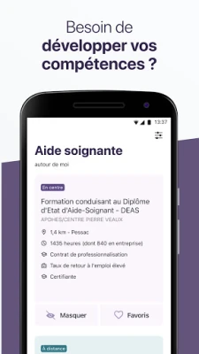 Découvrez votre chemin vers l'emploi avec cette application intuitive, conçue pour simplifier votre recherche de formation idéale. Que vous ayez une idée précise d'un métier ou que vous exploriez de nouvelles compétences, notre plateforme vous guide. Saisissez votre domaine d'intérêt ou la profession visée, ajoutez votre localisation, et accédez à une sélection pertinente de programmes. Plongez au cœur de chaque opportunité : examinez le contenu pédagogique, les taux de retour à l'emploi réussis, et les avis éclairés d'anciens participants. Une fois votre intérêt piqué, la mise en relation est directe : contactez l'organisme de formation en quelques gestes pour obtenir toutes les informations complémentaires nécessaires à votre prise de décision.