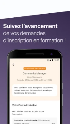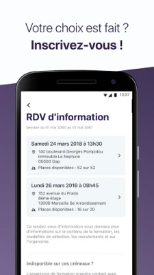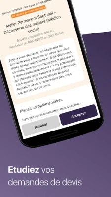 Pour les demandeurs d'emploi inscrits auprès de Pôle emploi, cette application France Travail va plus loin. Prenez rendez-vous directement avec les organismes de formation pour des réunions d'information, suivez l'évolution de vos entretiens et pilotez l'ensemble de vos projets de formation avec une aisance remarquable. De plus, simplifiez la gestion de vos demandes d'Aide Individuelle à la Formation (AIF) : visualisez et étudiez vos devis en ligne. En quelques clics sécurisés, vous pouvez accepter ou refuser les propositions reçues, transformant les démarches administratives en un processus fluide et réactif, entièrement pensé pour votre progression.