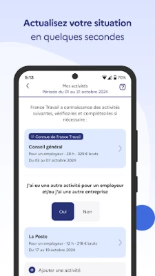 L'application France Travail est votre alliée essentielle pour une gestion sereine et autonome de votre parcours professionnel. Centralisez toutes vos démarches, de la déclaration mensuelle de votre situation à la notification d'événements marquants comme une période de travail ou un stage. Gardez un œil vigilant sur le calendrier des actualisations et les dates prévisionnelles de vos versements, tout en consultant l'historique détaillé de vos précédentes déclarations. Chaque évolution dans votre situation peut être reportée en toute simplicité, directement depuis votre mobile.