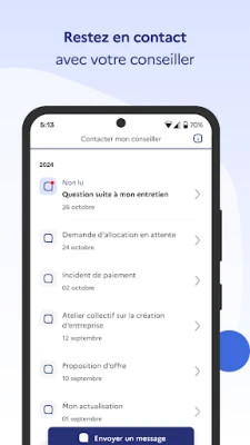 Maintenez un lien privilégié et direct avec les équipes de France Travail. Envoyez des messages à votre conseiller dédié, consultez ses disponibilités en temps réel et planifiez vos rendez-vous directement depuis l'application. Gérez l'intégralité de votre agenda de rencontres avec France Travail et trouvez aisément l'agence la plus proche de vous, où que vous soyez en France, grâce à un outil de recherche intuitif. France Travail s'engage à évoluer constamment, enrichissant et améliorant ses services mobiles grâce à vos précieux retours pour toujours mieux accompagner votre retour à l'emploi et faciliter vos démarches.