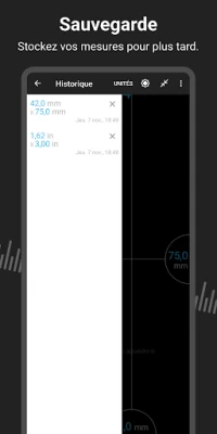 Pensé pour votre confort et votre efficacité, cet outil intègre un mode nuit élégant, qui ménage vos yeux et préserve la batterie de votre appareil lors d'utilisations en basse lumière. Ne perdez plus jamais une mesure importante : la fonction de sauvegarde vous permet de stocker vos données pour les consulter ou les réutiliser à tout moment. Et pour les transferts précis, affichez une longueur prédéfinie, simplifiant ainsi vos projets. C'est la solution de mesure complète, sans compromis.