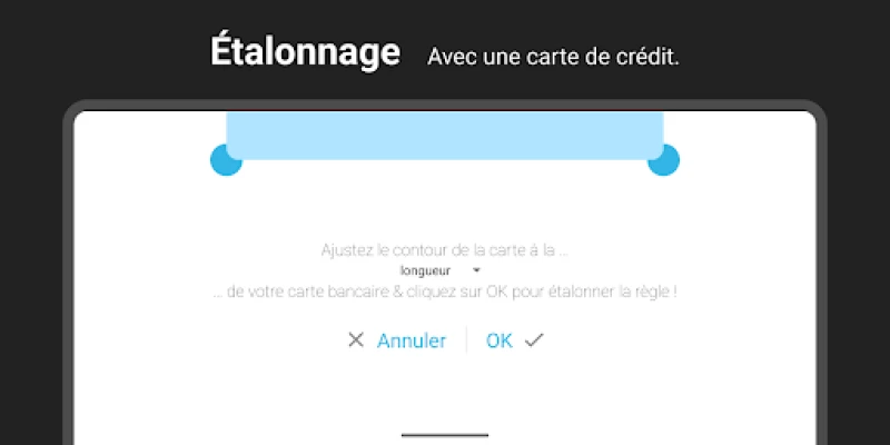 Calibrez instantanément votre règle numérique sur l'appareil avec une pièce ou une carte bancaire. Dites adieu aux règles physiques ! Profitez de mesures précises et pratiques, partout et à tout moment. La mesure simplifiée, toujours avec vous.